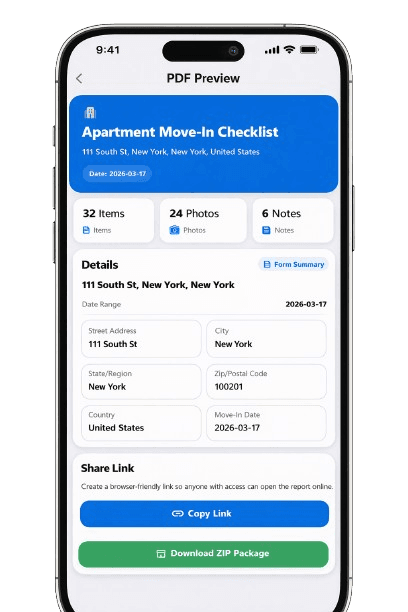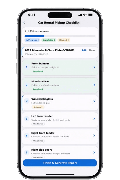 From apartment walkthroughs to car rental pickups. Start in seconds with guided checklists.