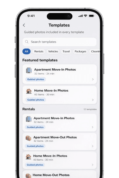 From apartment move-ins to car rental returns every template comes with a guided photo checklist and estimated time.